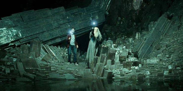 在哈利和邓布利多穿过山洞寻找魂器之后,有一个短暂的场景,可以看到哈利带着邓布利多出来。这时,邓布利多低声对哈利说:“哈利,我不担心,我和你在一起。”